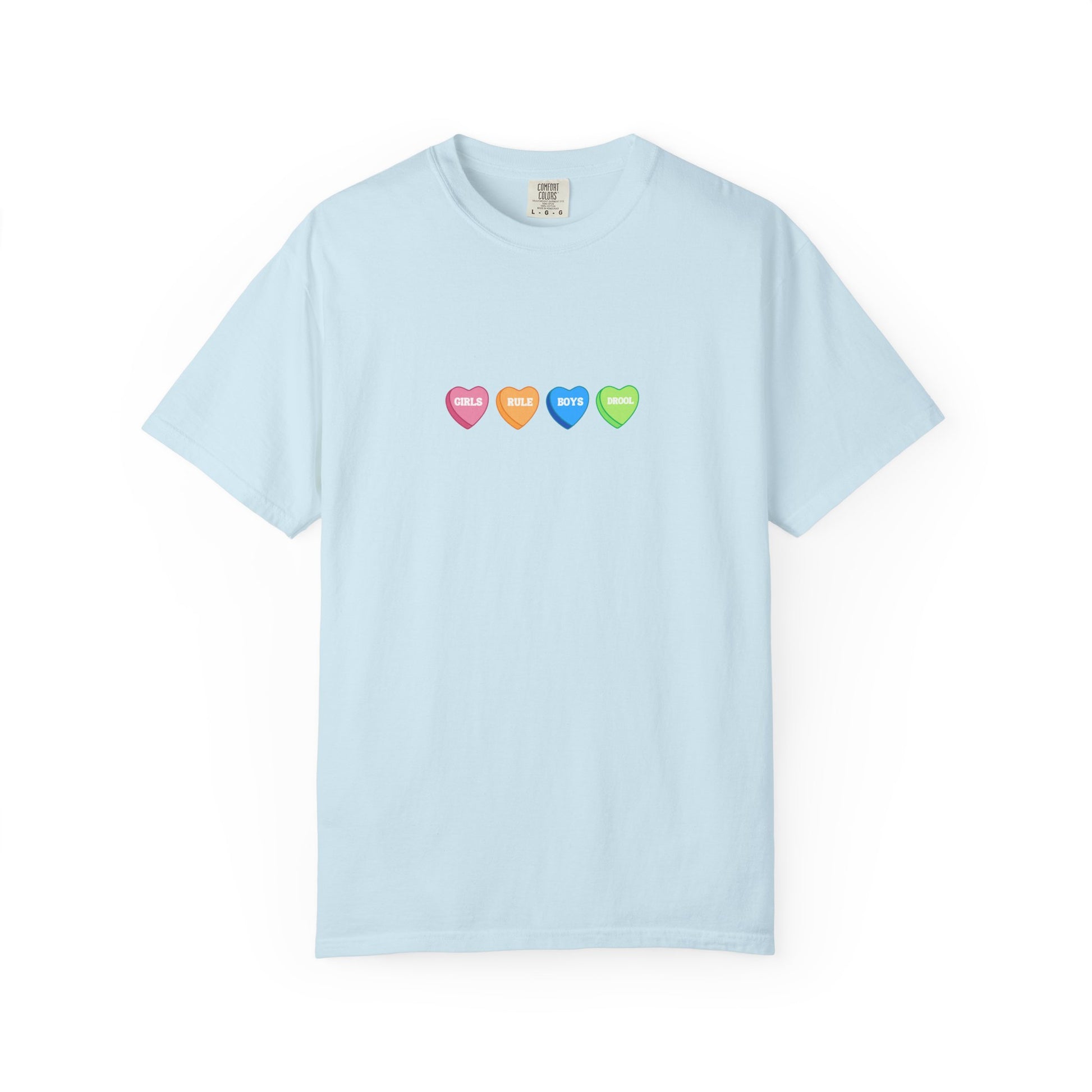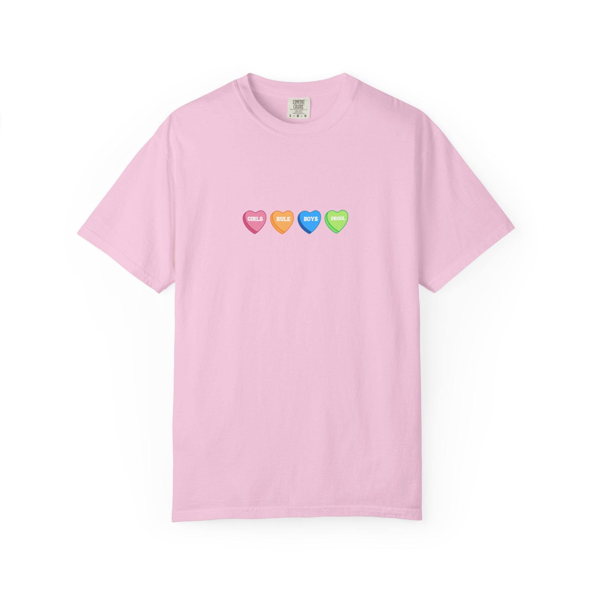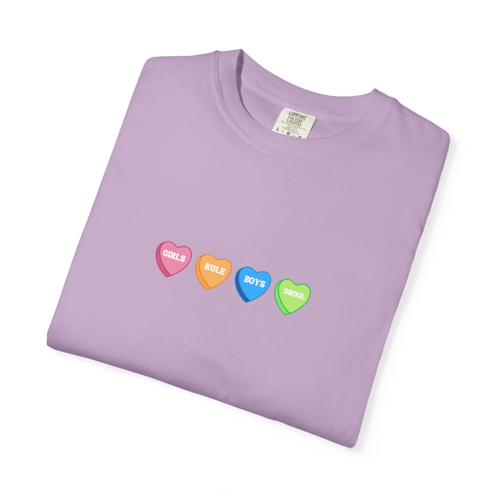 Introducing our "Girls Rule, Boys Drool" Candy Hearts Comfort Colors Tee - Share a Sweet Message of Empowerment and Love!