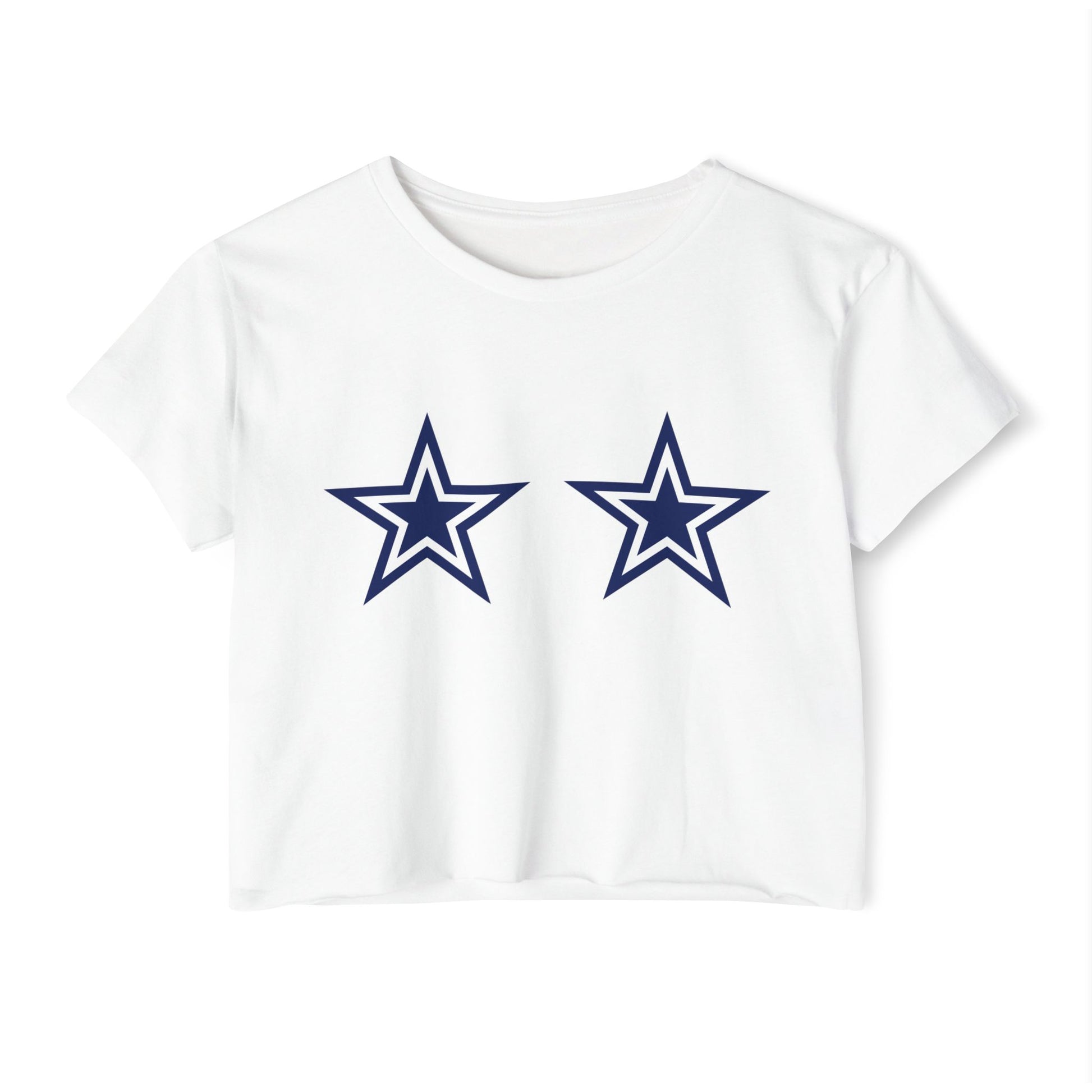 A Dallas football-themed cropped white tee with stars and navy accents, perfect for gameday Sundays. The cute stars on the boobs add a playful touch to this women's festival crop top. Ideal for fans of the cowboys and those looking for a stylish top to wear to games or watch parties.