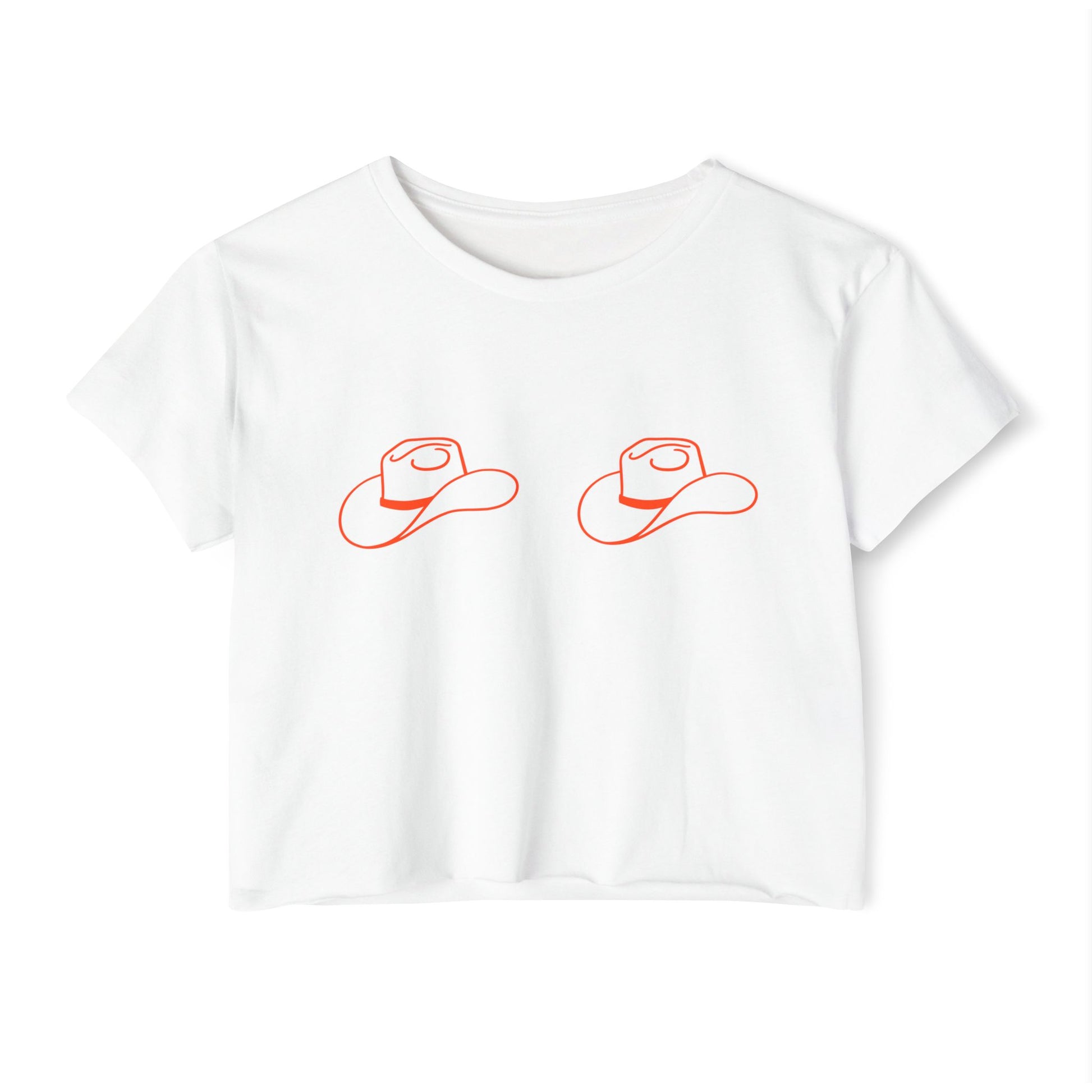 A super cute white crop top with cowgirl hats as the bra perfect for a Nashville or Texas bachelorette party or a girls weekend. Great for country concerts, this crop top exudes a fun and feminine vibe. Ideal for women looking to stand out at special events or festivals.